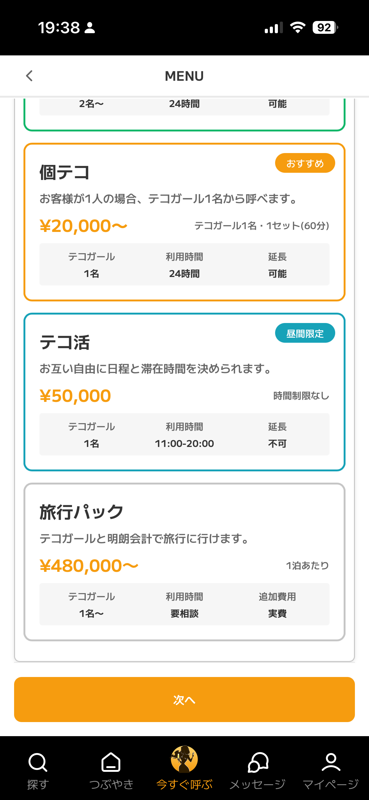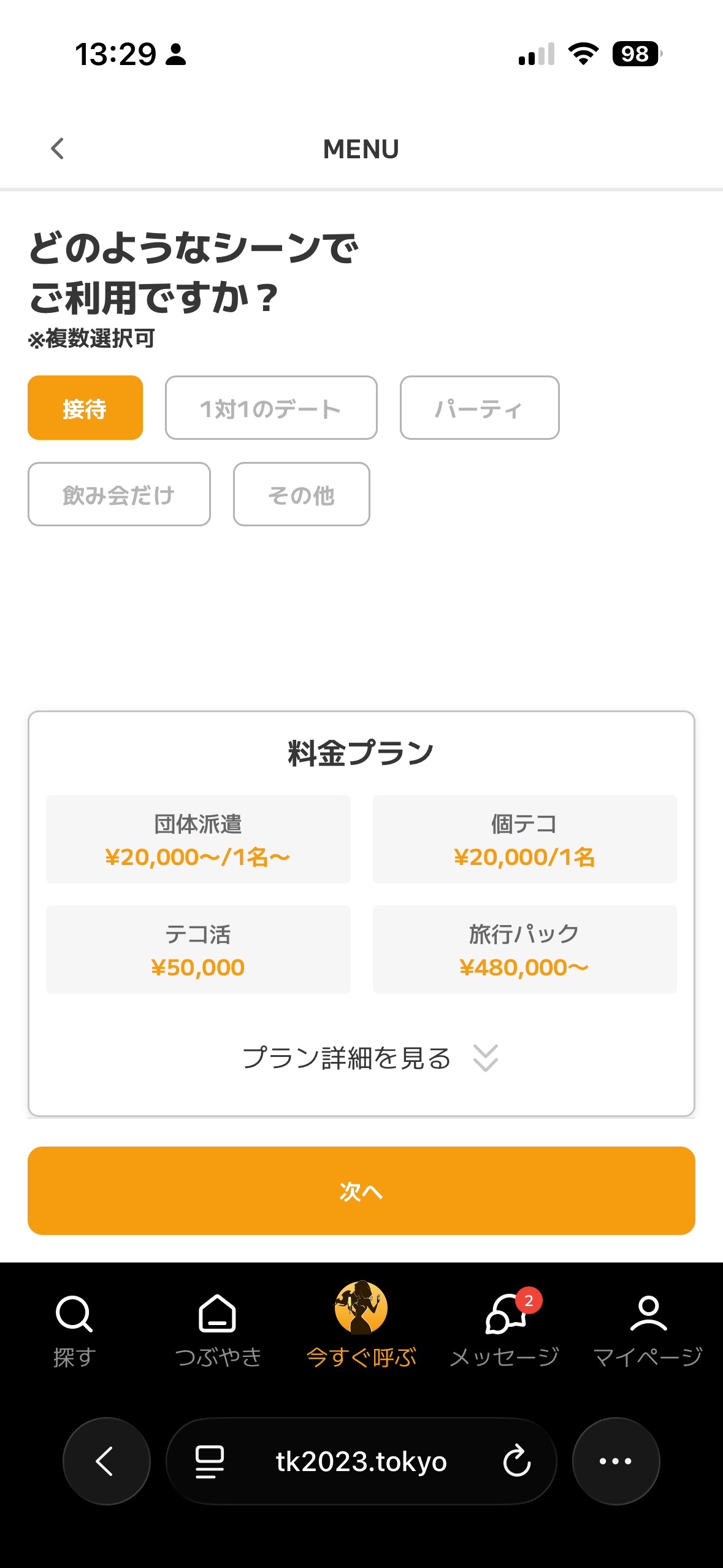 登録が済んだら、まずは新しい料金システムをチェック。個テコ(1セット/60分)は一律20,000円というシンプル設計で、「あれ?これだけ?」と拍子抜けするほど分かりやすい。