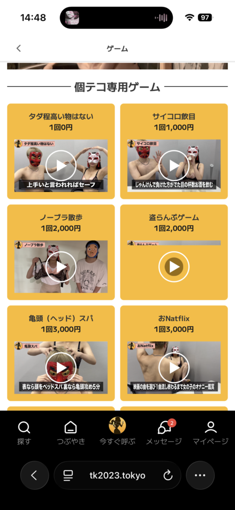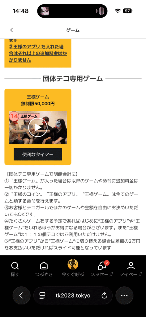 団体テコでは、王様ゲームという神ゲームがあります。『王様ゲーム』を依頼したらその後のゲーム料金や命令には追加料金は一切かかりません。