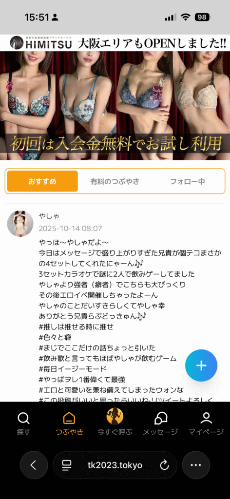 特に当日予約をお考えの方は、つぶやきをチェックして女の子の今の状況を確認すれば、より素敵な出会いが期待できます。
