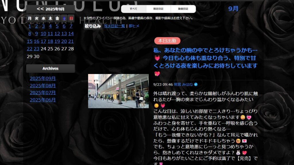 Ranunculus(ラナンキュラス)は、スタッフが撮影したオリジナル写真に加え、女性自身が投稿する写メ日記や短い動画が豊富に揃い、パーソナルジムでのトレーニング風景や、六本木の街並みを歩く様子などがリアルに共有されます。これにより、指名前に女性の健康的なライフスタイルや人柄が伝わり、「プロフィール通りの美しさ以上」との信頼感が生まれます