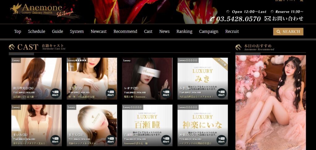 アネモネは、東京・渋谷を拠点にしている洗練された美女たちが織りなす究極の癒し空間を提供する高級デリヘルです。サービス形態としては派遣型ヘルスに分類され、ハイレベルな在籍女性たちのきめ細やかなサービスで高級ソープランドのような満足感が得られると評判です。